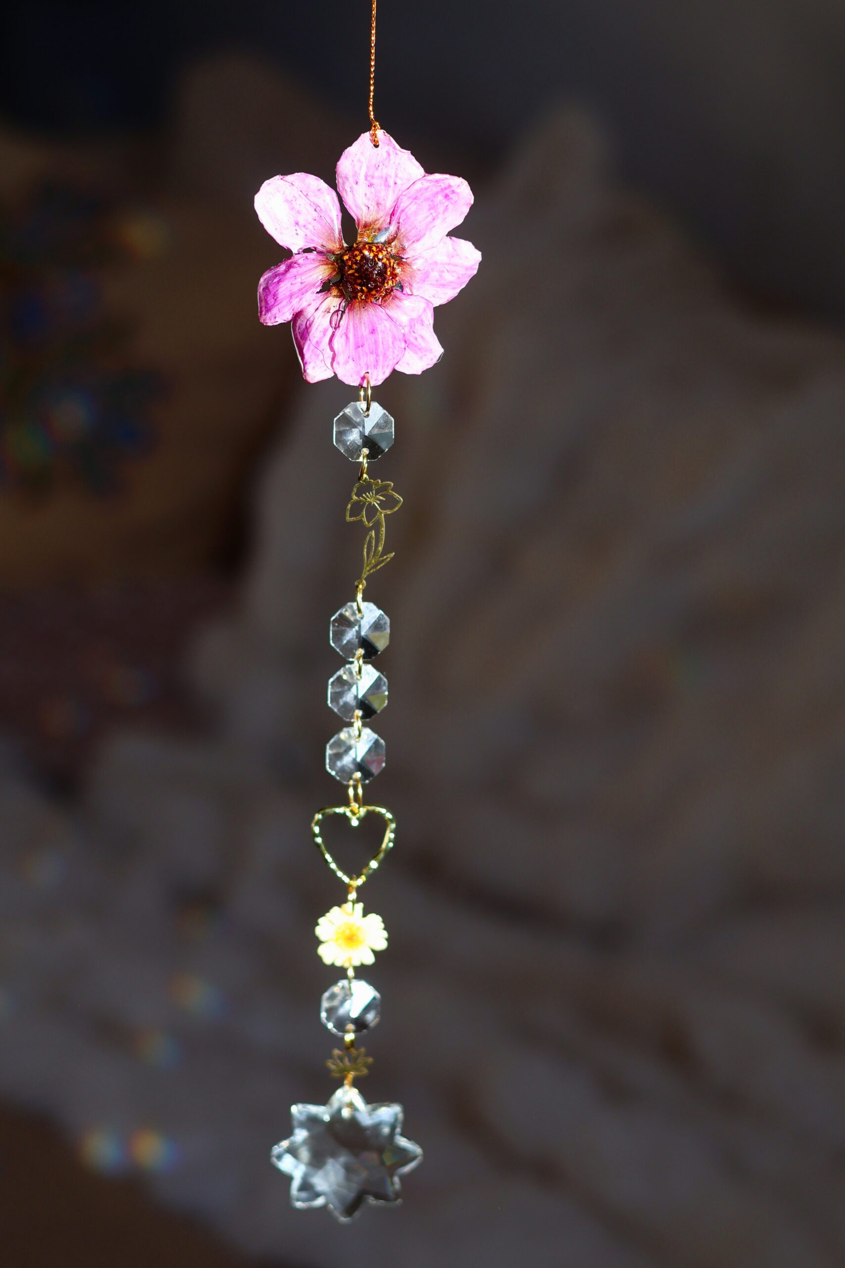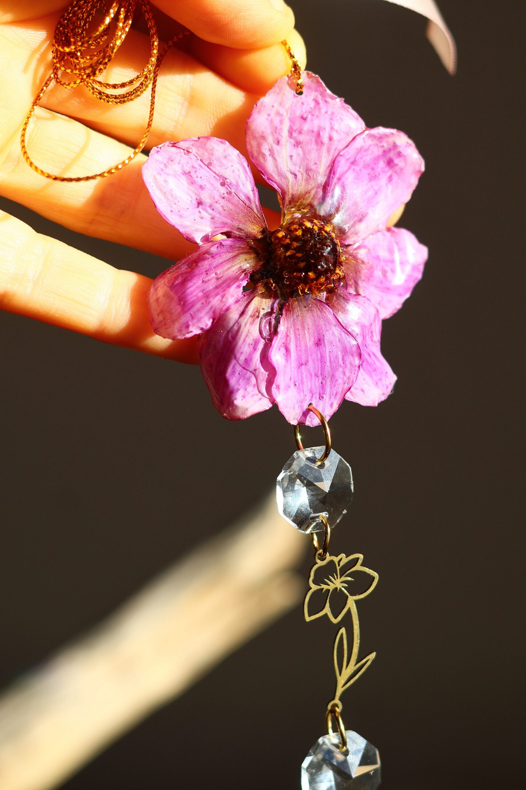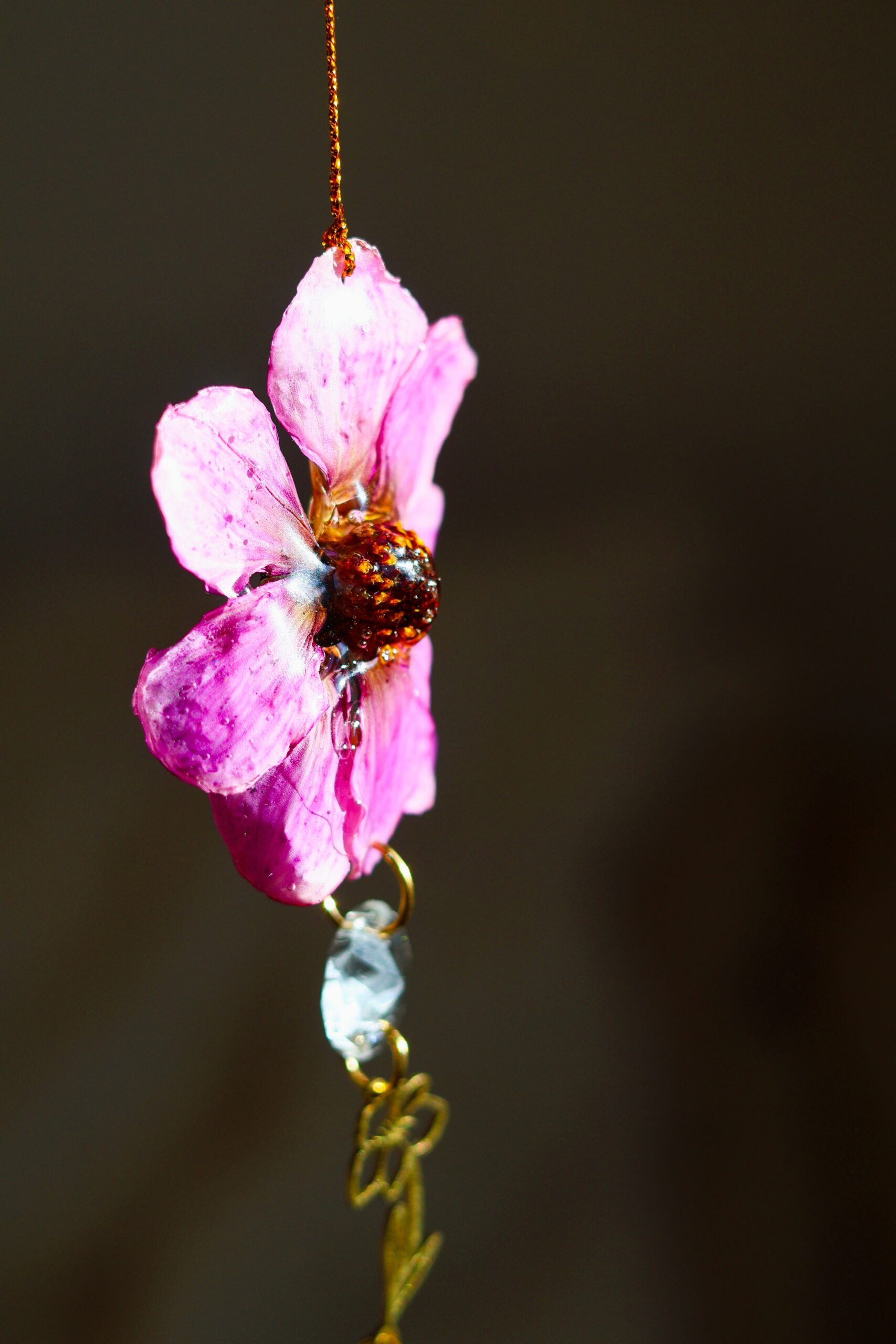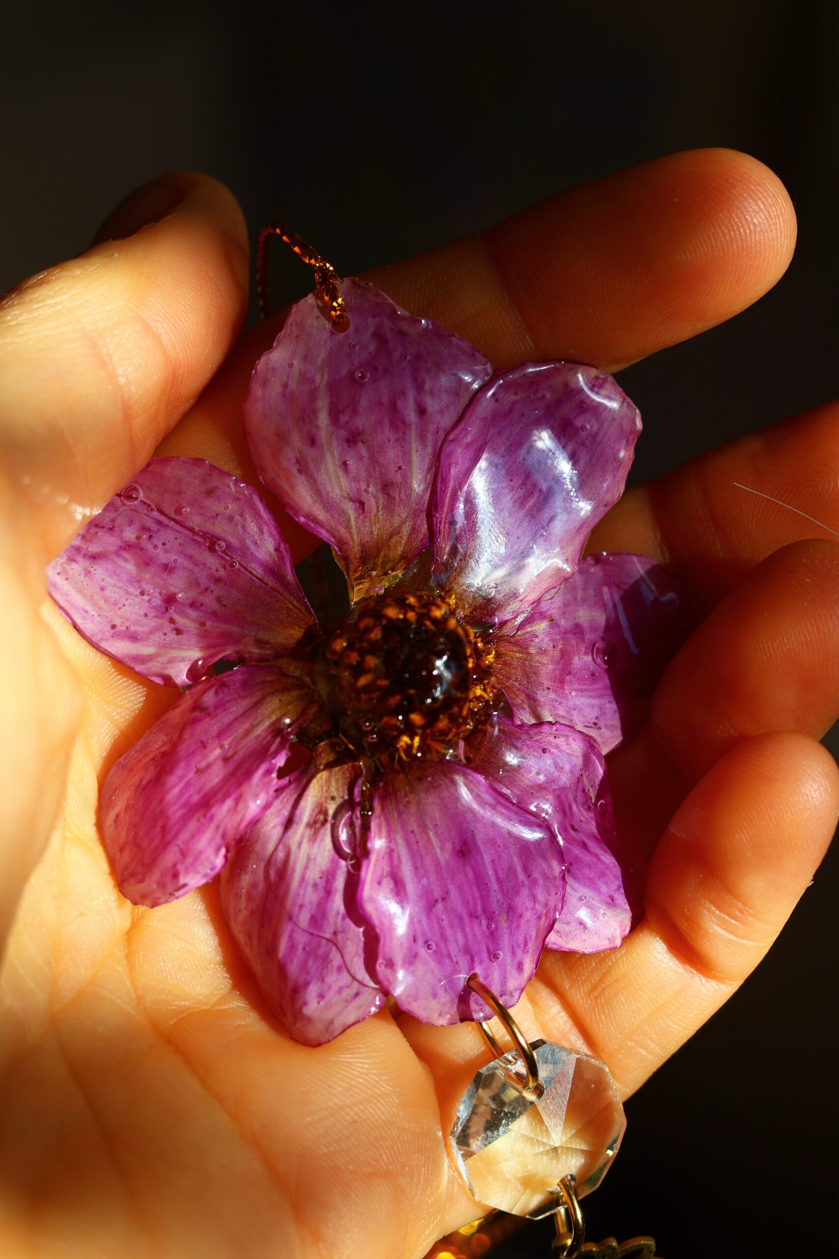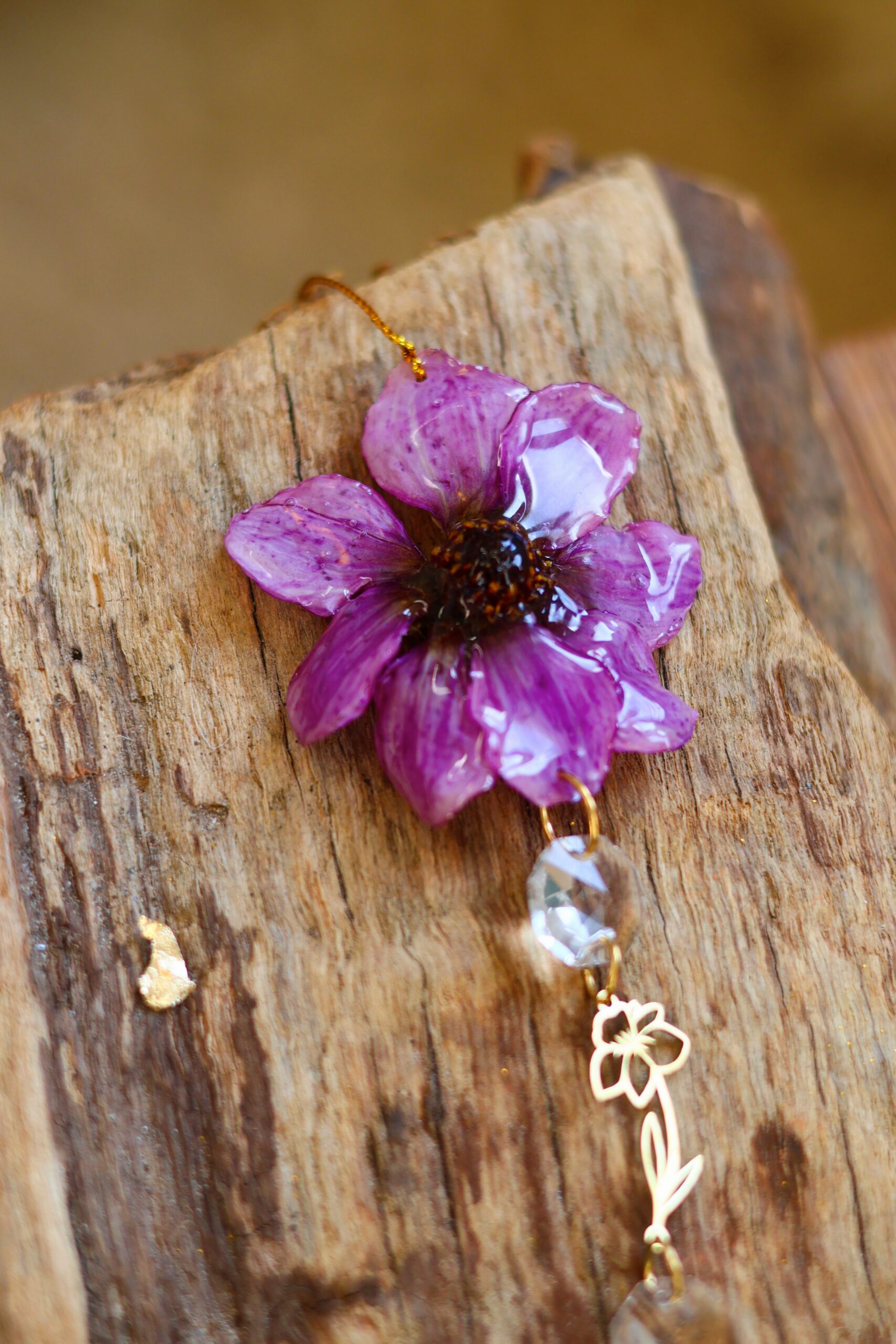 Cosmos récolté dans les Vosges. Séché pour garder sa forme, puis délicatement enrobée de résine.