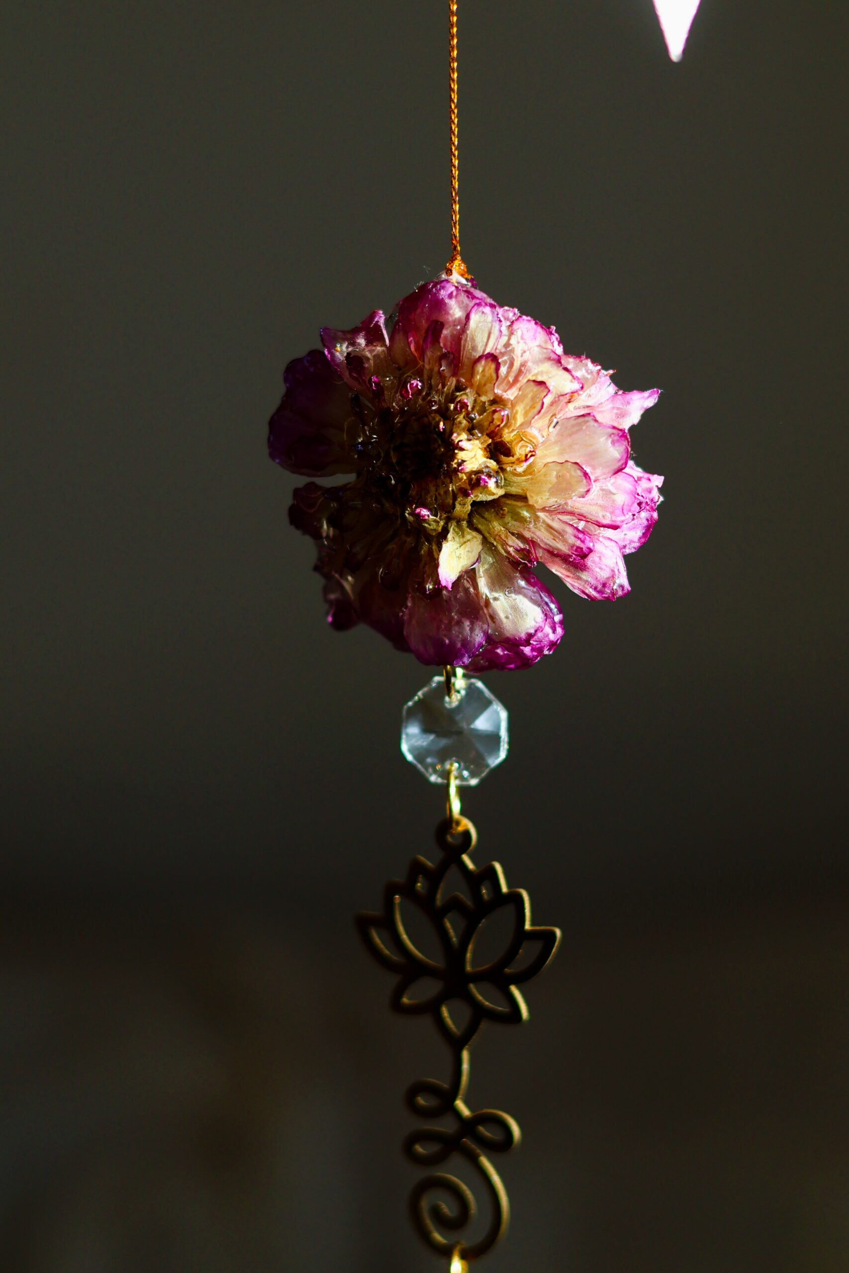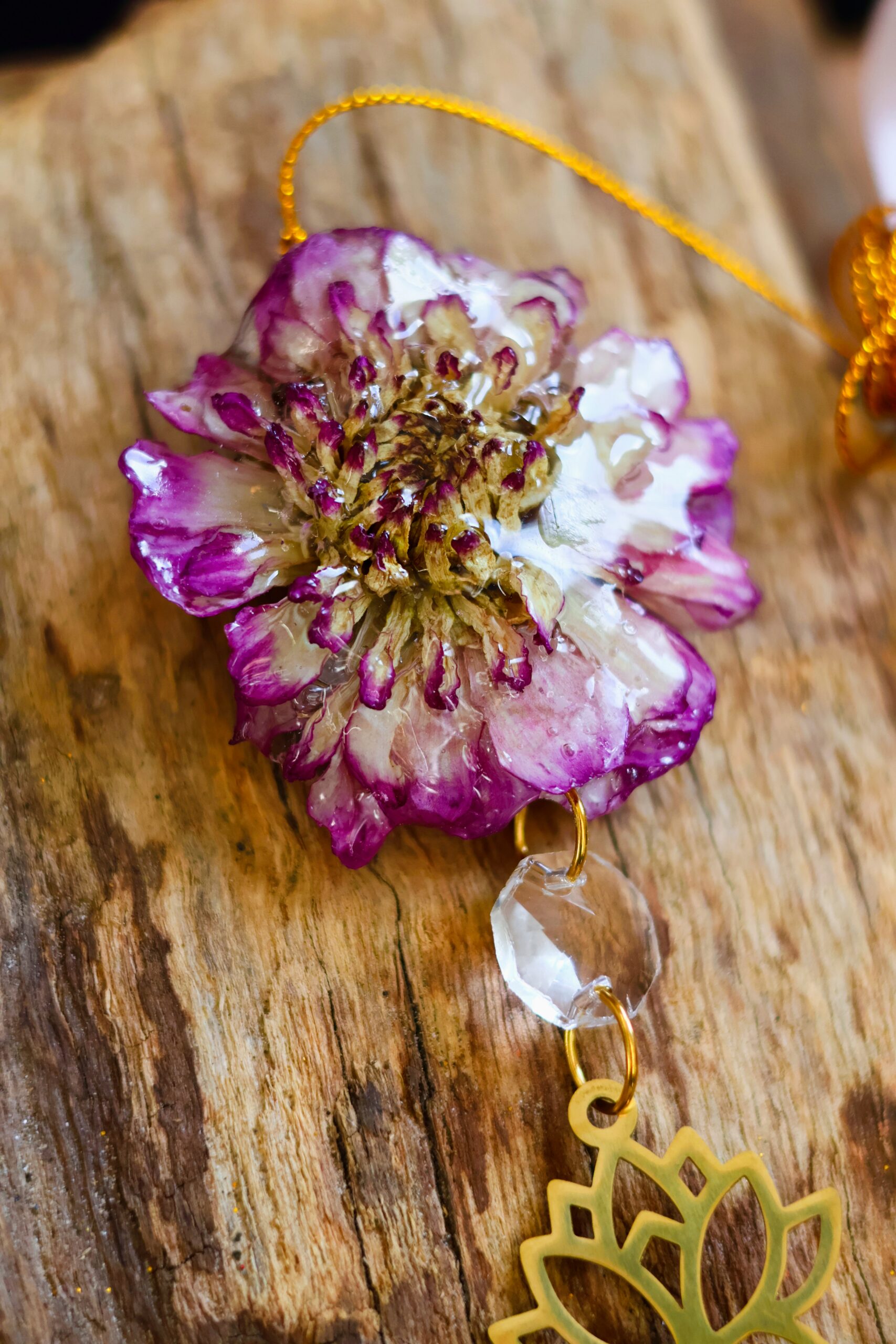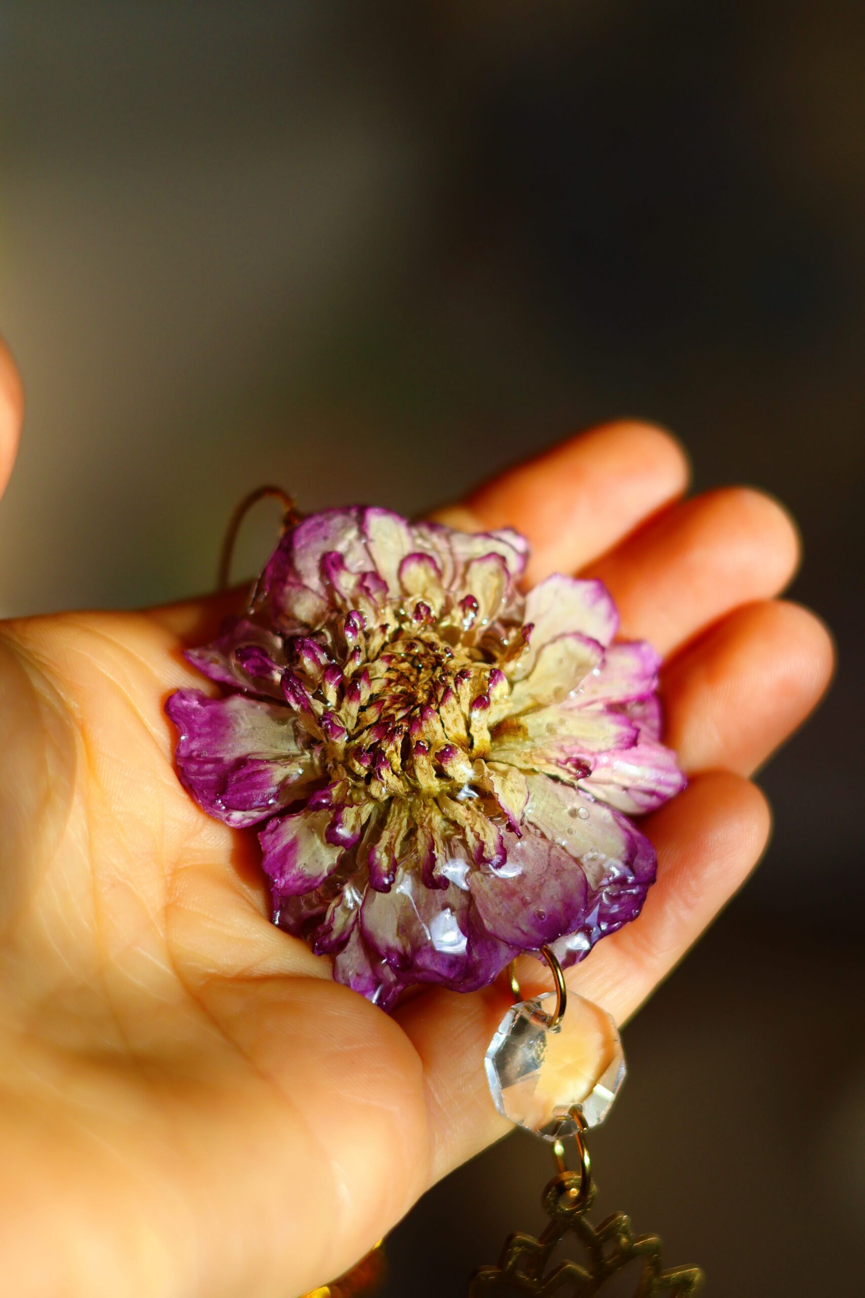 Dalhia récoltée dans les Vosges. Séchée pour garder sa forme, puis délicatement enrobée de résine.