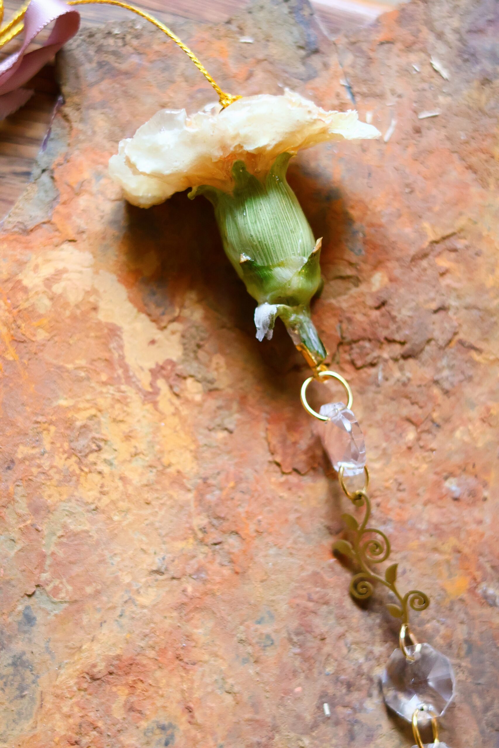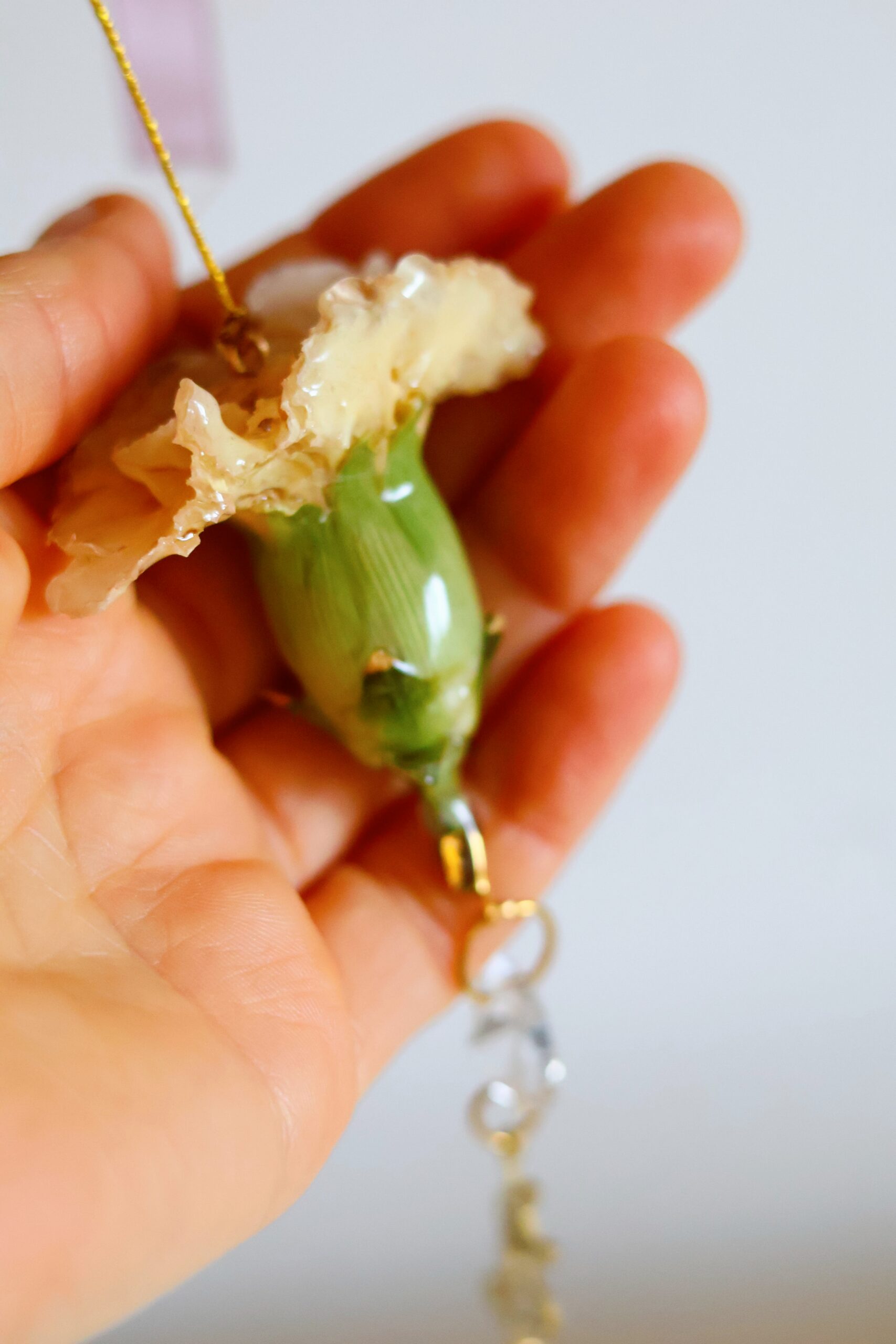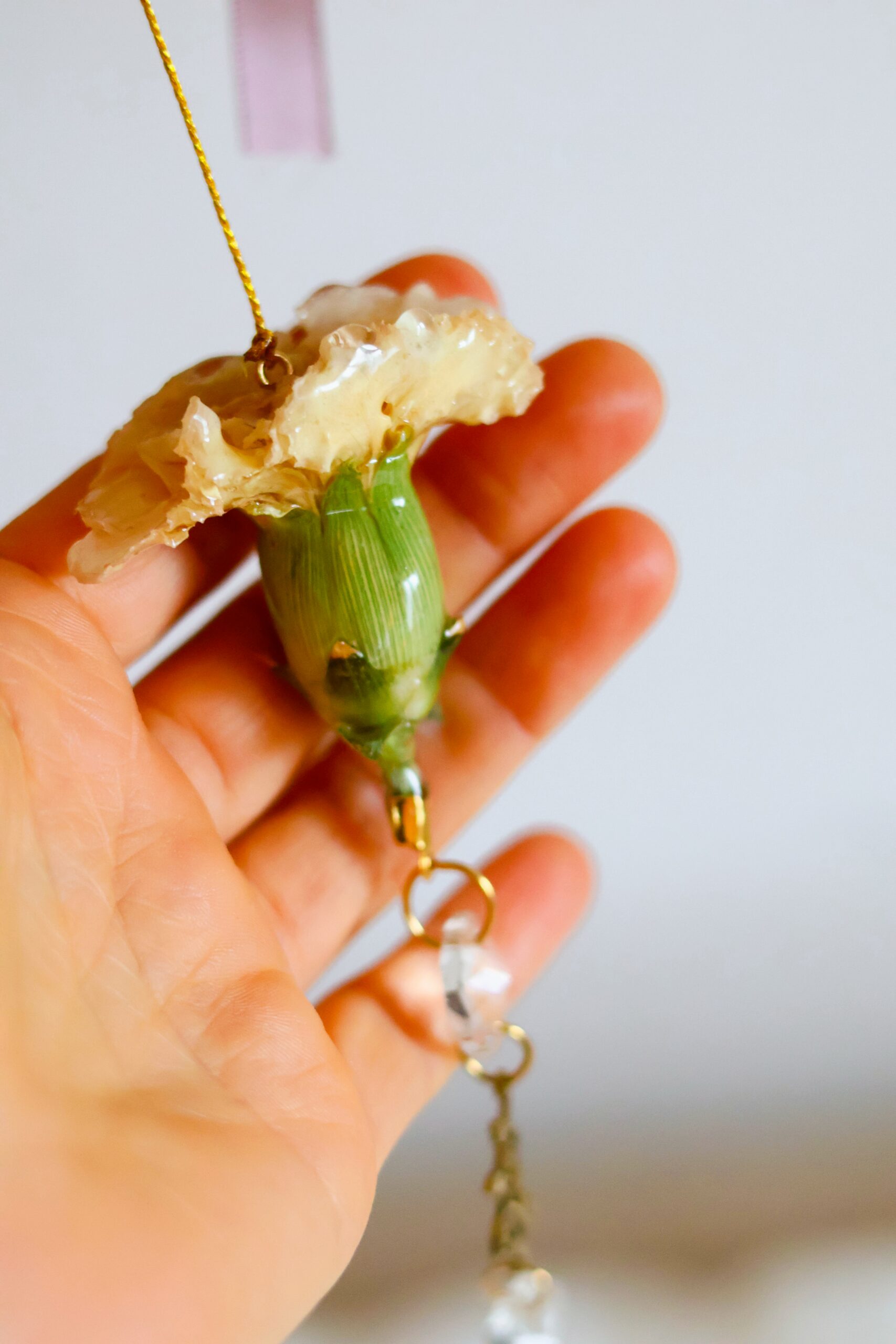 Oeillet récolté dans les Vosges. Séché pour garder sa forme, puis délicatement enrobé de résine.