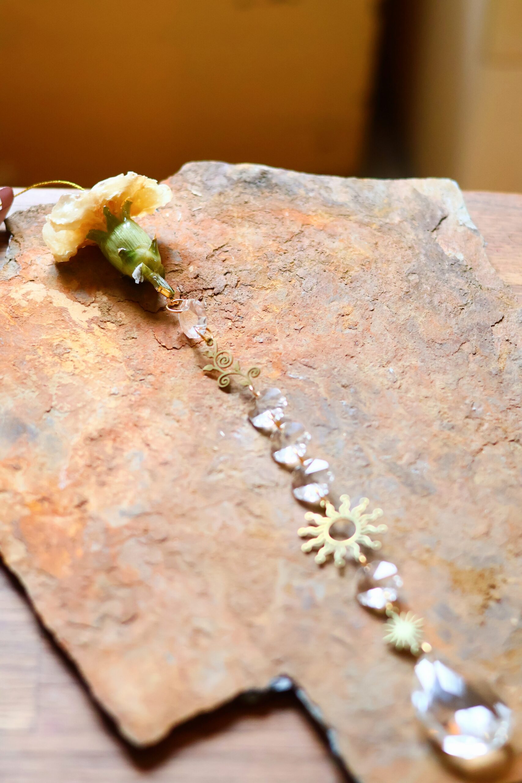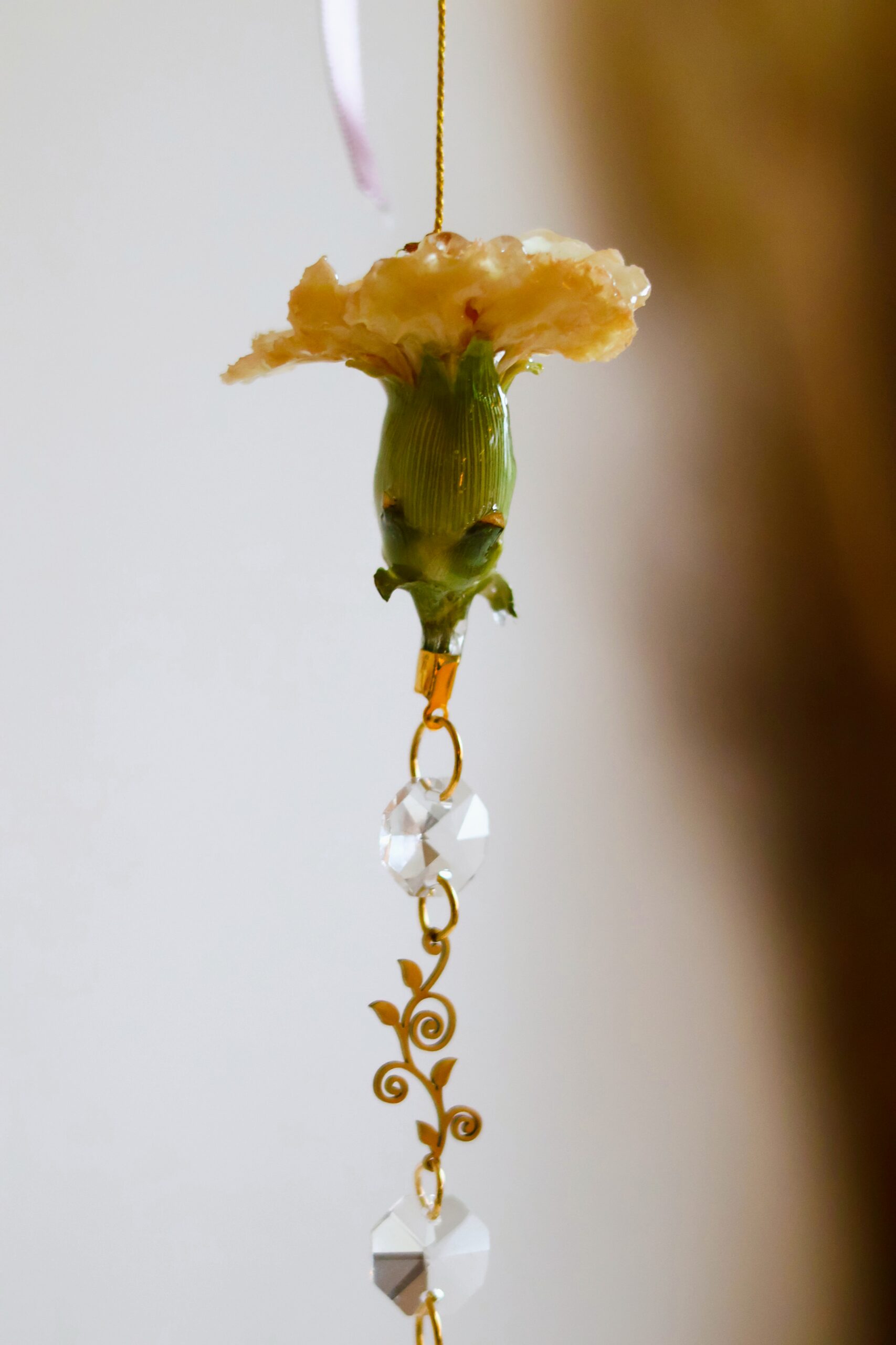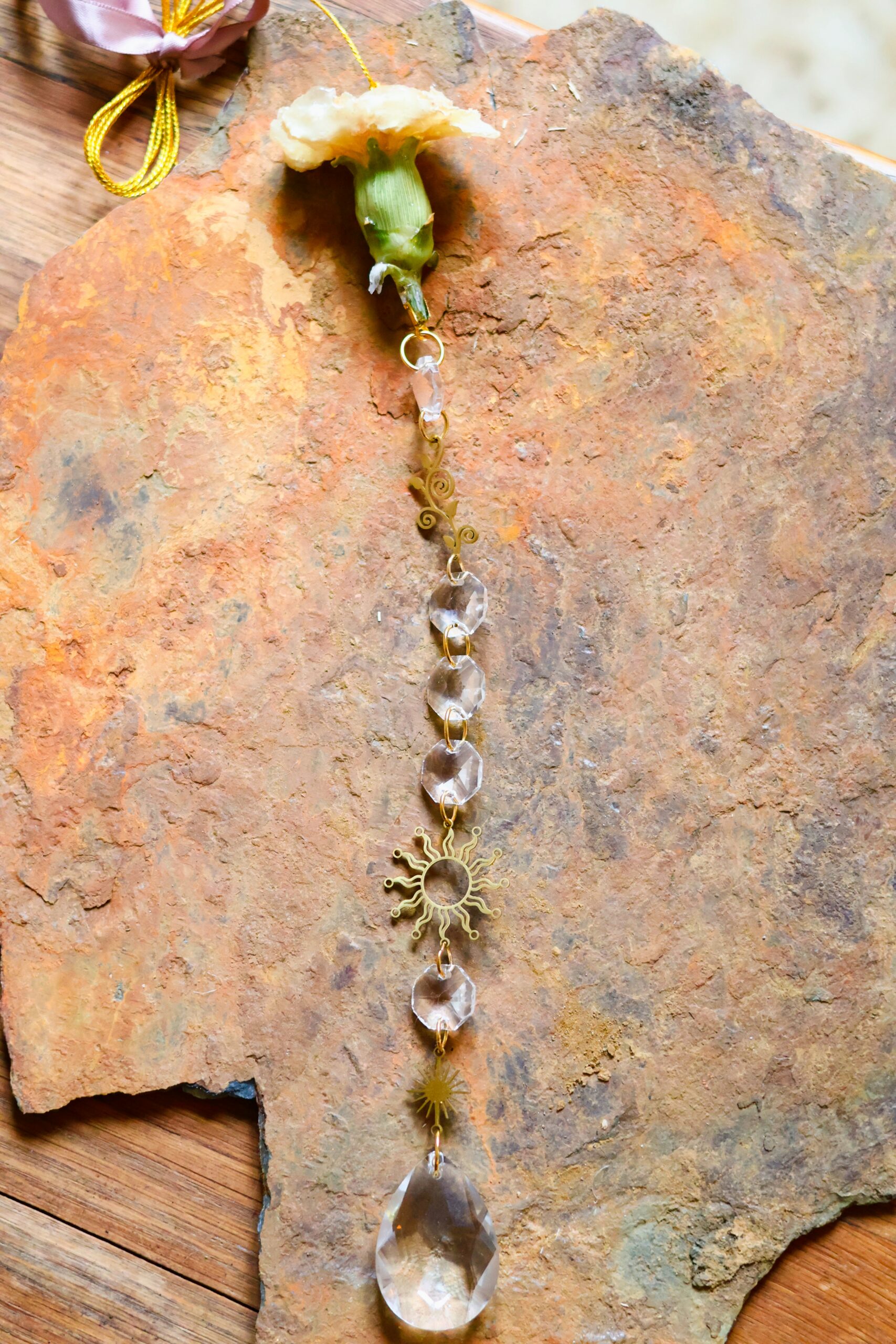 Oeillet récolté dans les Vosges. Séché pour garder sa forme, puis délicatement enrobé de résine.