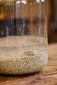 -Faire tremper 500g dans un bocal en verre, il faut que l’eau dépasse d’au moins 3 cm au dessus du sarrasin