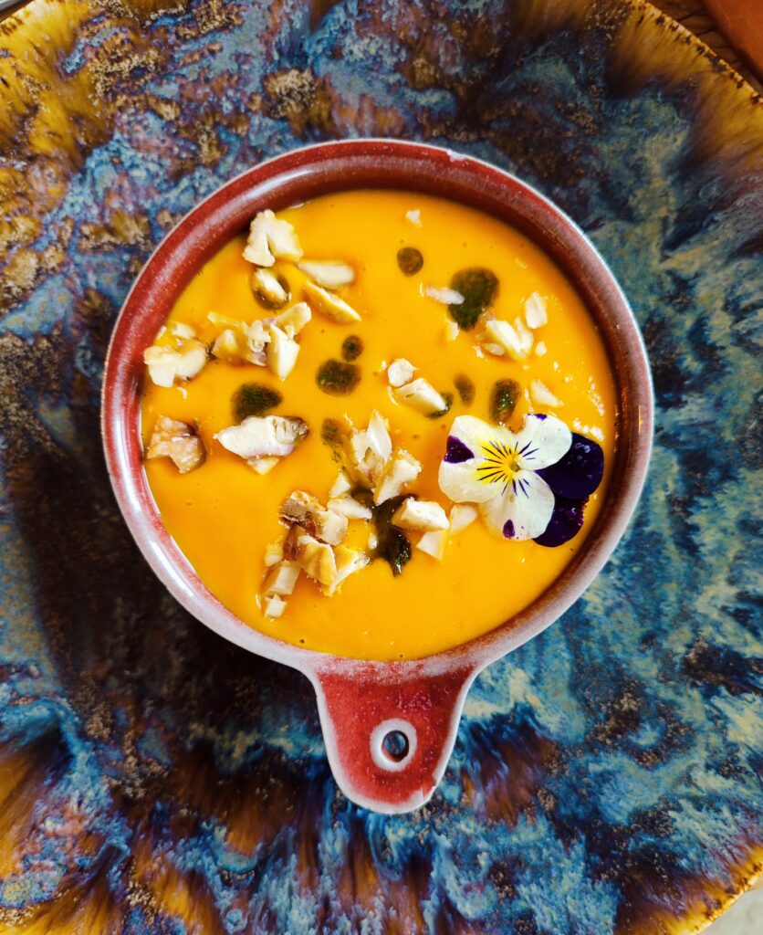 veloute de potimarron, brisures de chataignes et huile aromatisée à la berce sauvage
